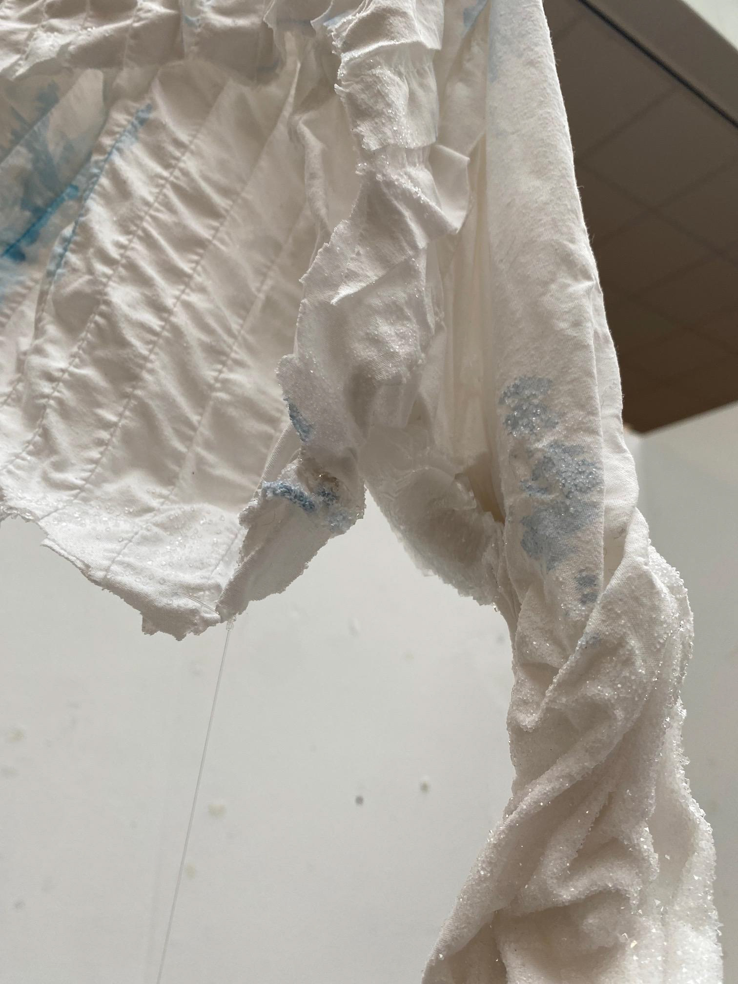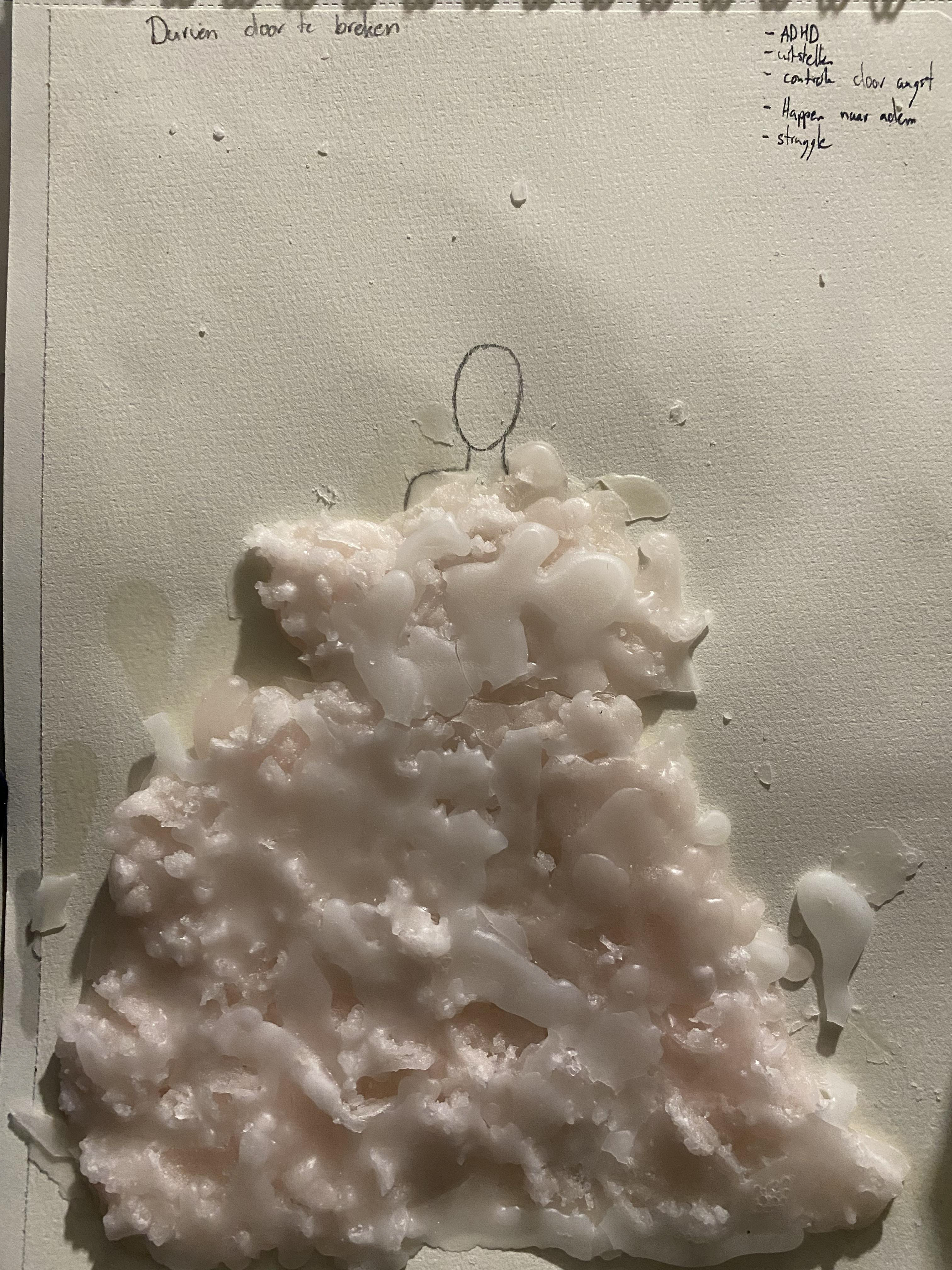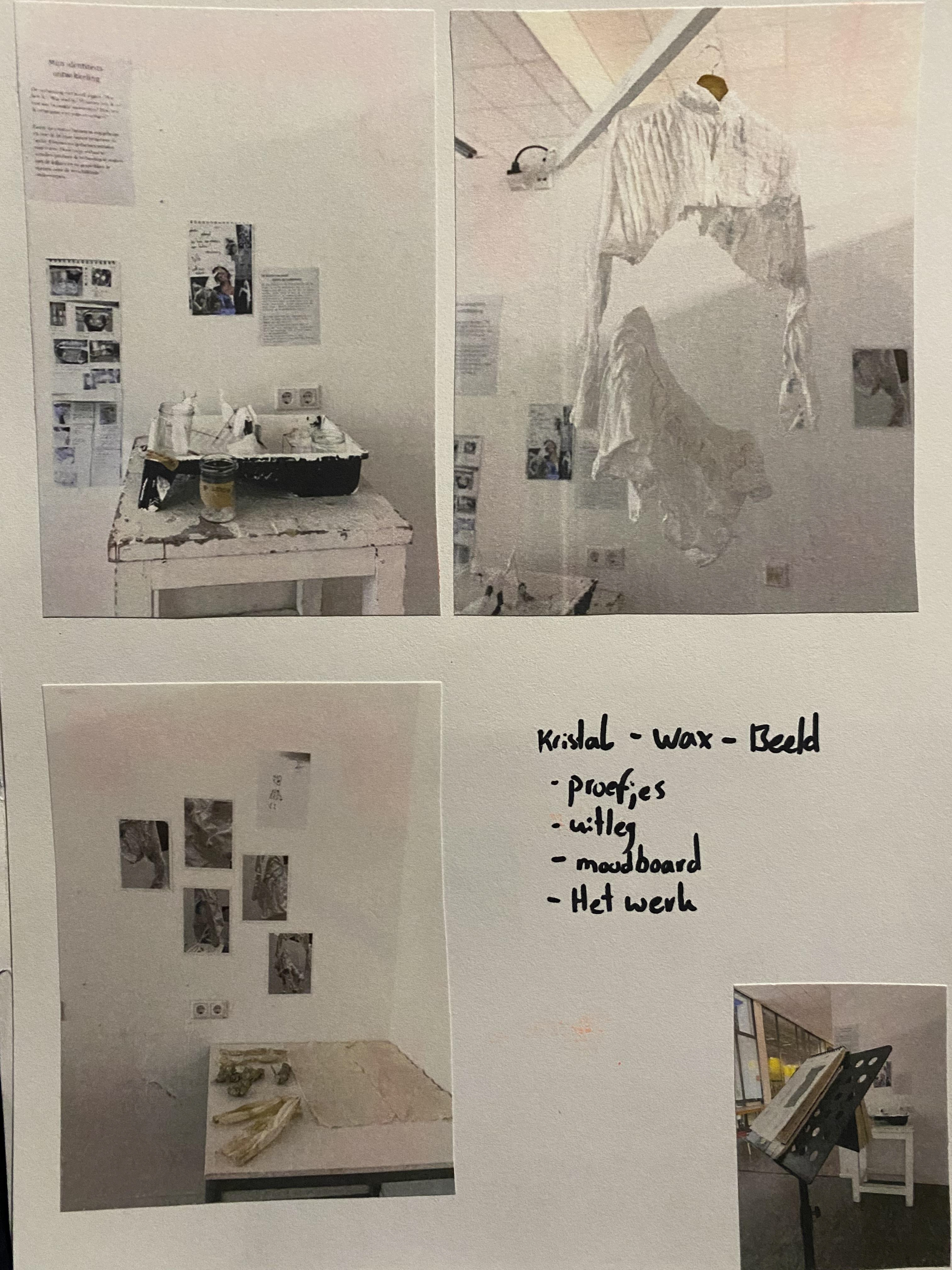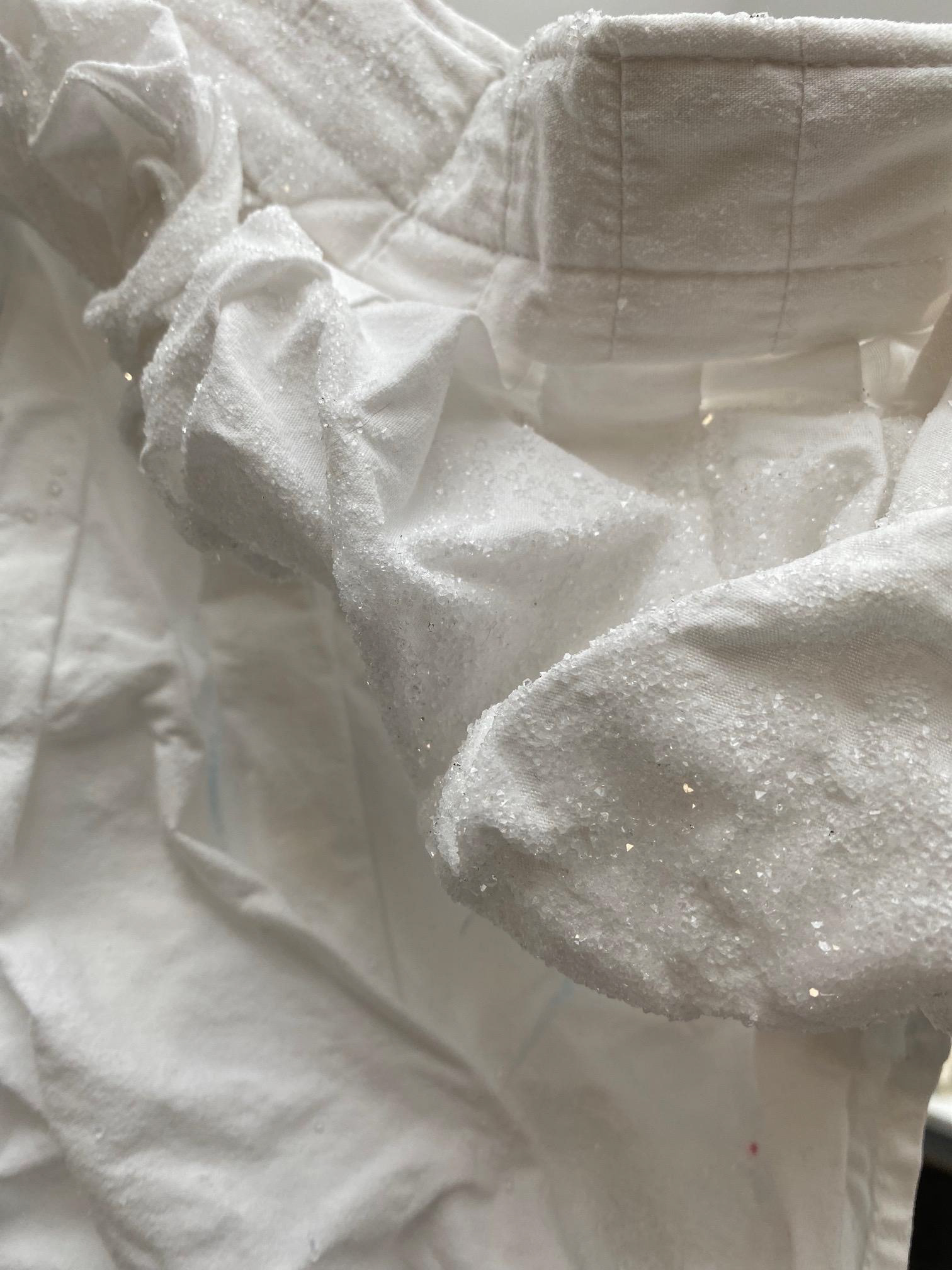 Experimenting with different materials like plaster, textile, wax and cristals. Developing her own cristals and transforming them into a garment.